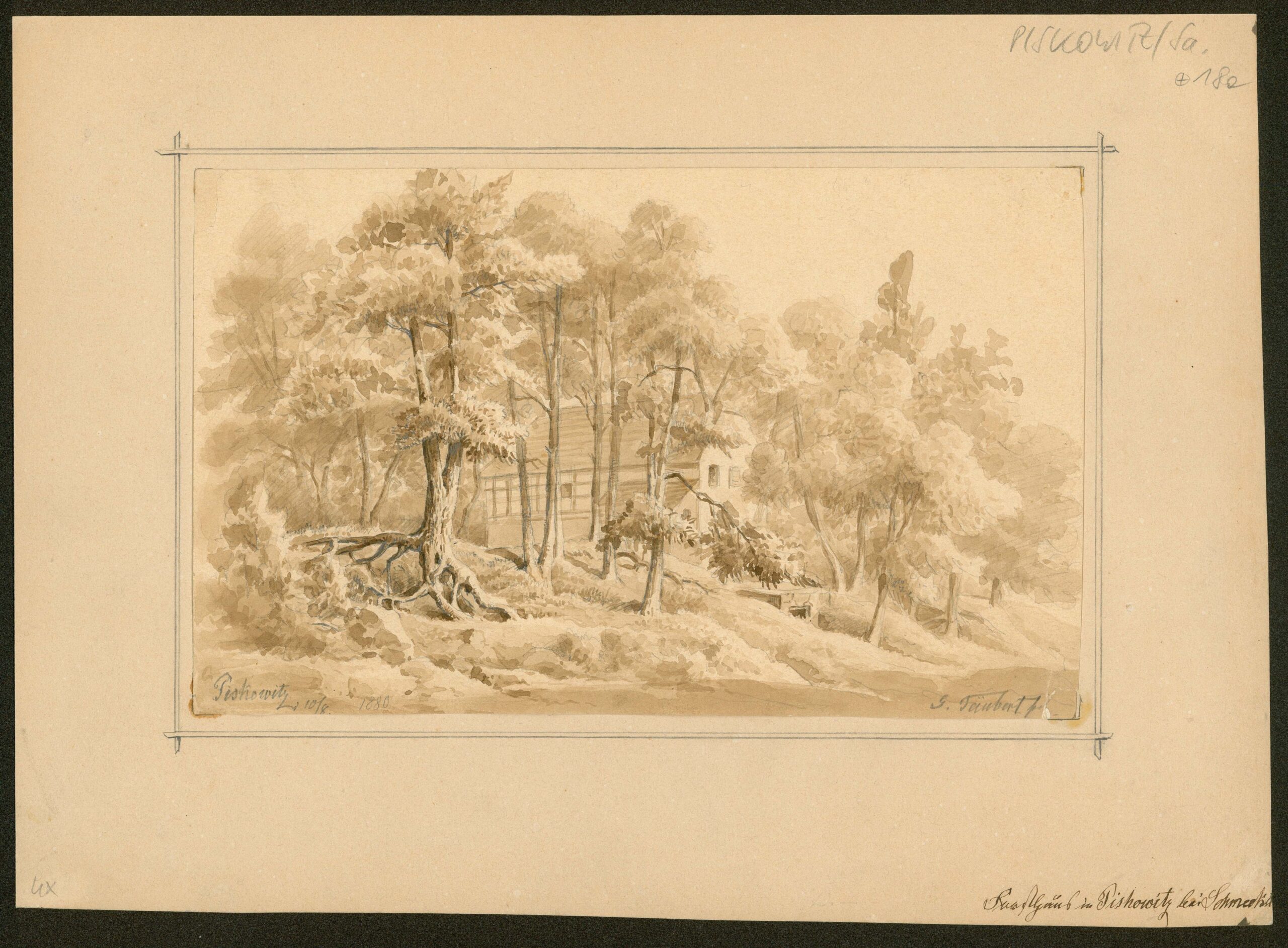 Tutón cuni akwarel nad wołojnikom Gustava Täuberta pokazuje Pěskečansku hajnkownju, zapołoženu do měrneje, ze swětłom přepławjeneje lěsneje scenerije. W monochromnym wašnju molowanja ze sepiju Täubert atmosferu wsy mištersce zapopadnje. Zwobraznjenje w małym formaće pokazuje na precizne wodźenje ruki přez wuměłca, kiž zamó krajiny kaž tež architekturu wustojnje do sceny sadźić.
